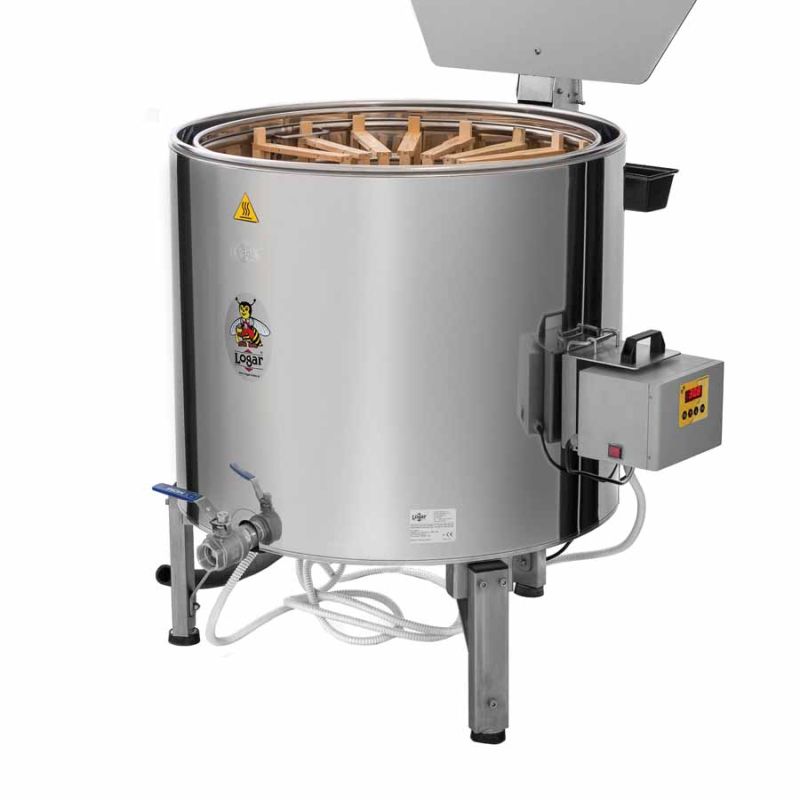 Une robuste centrifugeuse à cire Logar permettant de faire fondre rapidement et efficacement de vieux rayons, des rayons découpés, de la cire d'operculation ou des blocs de cire par centrifugation à la vapeur.