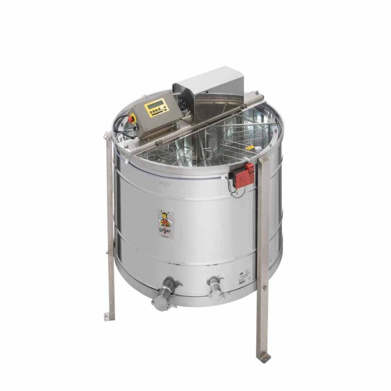 Extracteur auto-retournant 6 cadres de Logar avec motorisation 370 W / 230 V et commande entièrement automatique. L'extracteur est équipé d'un dispositif de sécurité intégré qui coupe automatiquement le moteur à l'ouverture du couvercle. Finition moderne du fond de cuve : soudé sans joint et incliné vers la sortie, assurant un écoulement très efficace du miel.