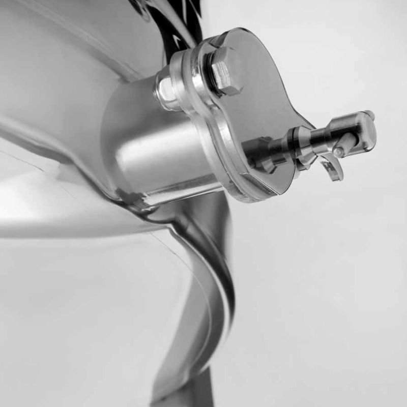 Le panier est conçu sans axe central traversant, ce qui permet de retourner facilement les cadres — un avantage pour de nombreux procédés de travail. Le fond de la cuve est parfaitement soudé et incliné vers la sortie ; le robinet inox de type pince est soudé au point le plus bas afin que tout le miel puisse être vidangé. Toutes les pièces en contact avec le miel sont en matériaux agréés pour l'alimentation, ce qui facilite grandement le nettoyage et l'hygiène.