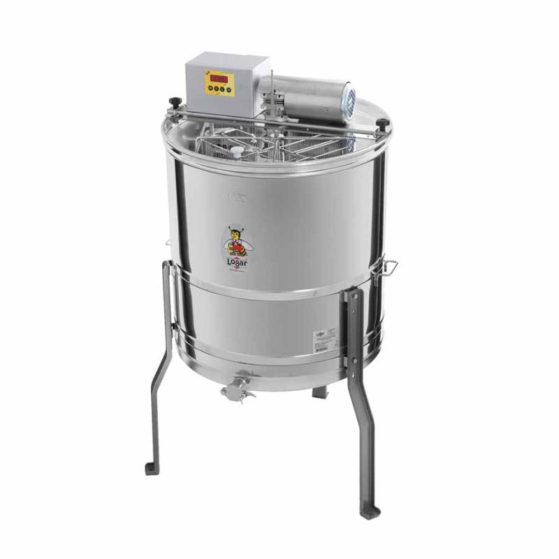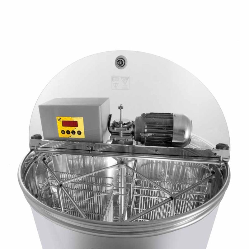 Extracteur à retournement automatique 4 cadres, motorisé 110 W/230 V, commande entièrement automatique et interrupteur de sécurité qui coupe automatiquement le moteur à l'ouverture du couvercle. Les technologies de pointe nous ont permis d'améliorer la conception du fond de cuve. Le fond de la cuve est soudé sans couture et incliné vers la sortie. Le robinet de vidange inox est soudé au point le plus bas afin de permettre l'écoulement complet du miel. Toutes les pièces en contact avec le miel sont fabriquées en matériaux agréés pour l'alimentaire. Le couvercle est en acrylique transparent. Une conception spécifique des pieds garantit une excellente stabilité de l'extracteur.
